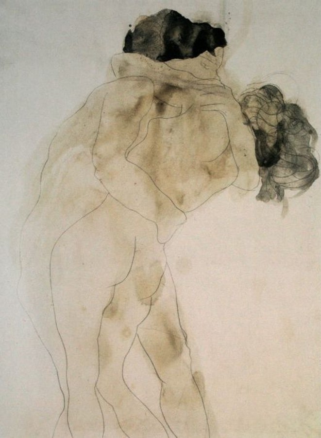 Egon Schiele, L’étreinte, 1917. C’est une peinture qui lui a valu 3 semaines de prison. Il montre un homme et une femme enlacés dans une étreinte. Il s’agit d’un autoportrait de Schiele et son épouse Edith. Ils sont allongés sur un drap blanc froissé, posé sur un couvre-lit jaune. La tête de la femme est couchée sur l’oreiller, son visage est détourné et sa main repose sur l’épaule de son partenaire. La pose fait référence au tableau Le Baiser de Gustav Klimt, que Schiele admirait et dont il avait étudié le travail.
