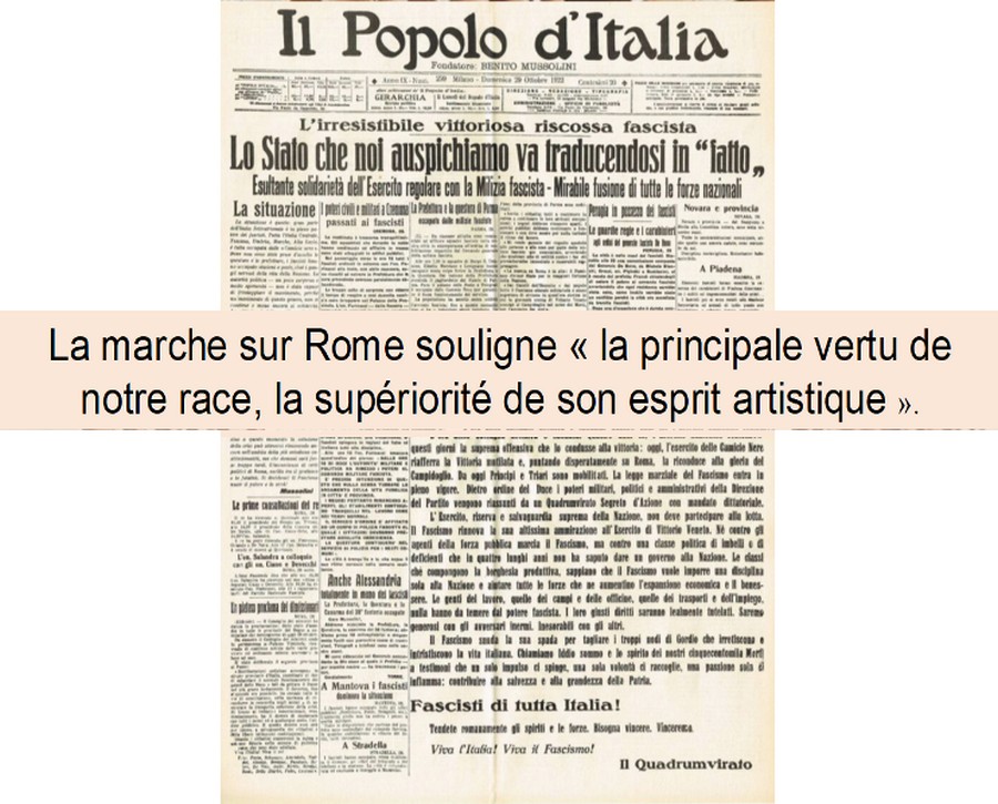 Quelques jours après la marche sur Rome, le 3 novembre 1922, Carlo Carrà, Achille Funi, Mario Sironi et Marinetti publient dans il Popolo d’Italia : cet évènement souligne « la principale vertu de notre race, la supériorité de son esprit artistique. » Ils applaudissent « le fascisme, chargé des valeurs de l’idéal » et son chef, Benito Mussolini, qui incarne le renouveau des arts.