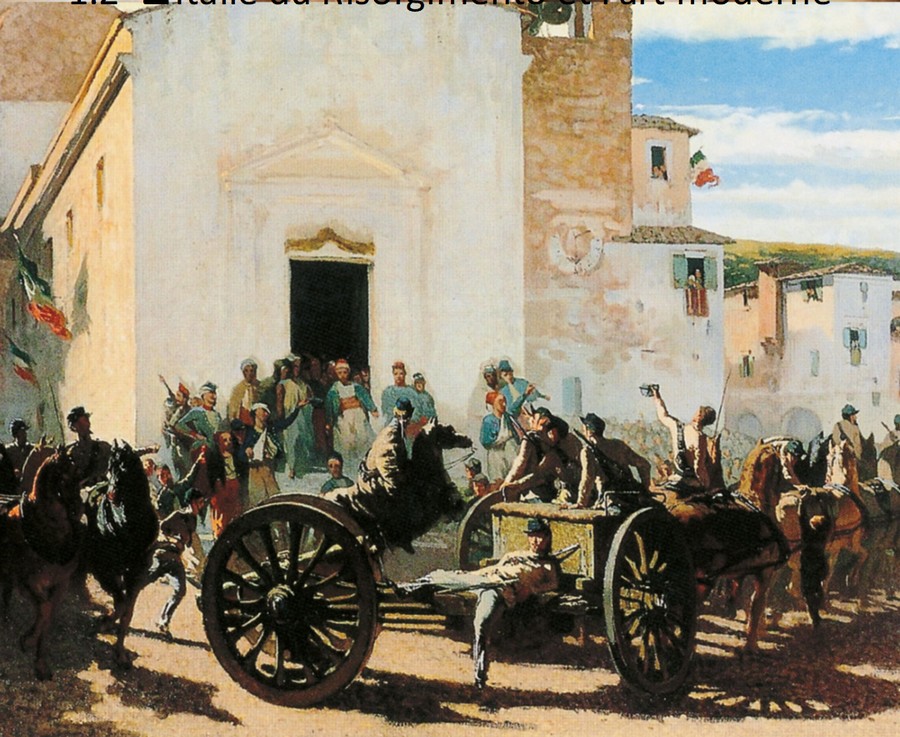 Cette féconde opposition chez Baudelaire est absente de l’Italie du Risorgimento. Risorgimento est proche du mot résurrection, un passage de la mort à la vie. Elle doit être comprise non comme un passage de la mort vers un vie future, mais comme un retour de la mort vers une vie passée idéalisée, celle de l’Italie, centre de la romanité. Les bouleversements politiques et culturels de l’Italie après 1861 n’impactent que très peu les arts plastiques, comme le prouve ce tableau d’histoire traditionnel.