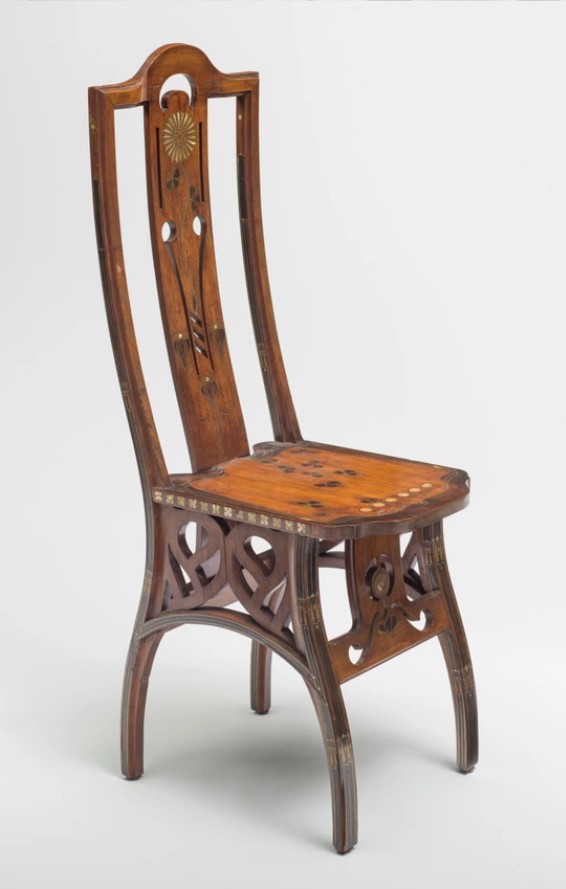 Eugenio Quarti (1867 1929), il a commencé dans l’atelier de Bugatti, puis élabore un style plus personnel. Il crée une chaise en noyer à décor floral stylisé, bois marqueté, incrustations de laiton et nacre.