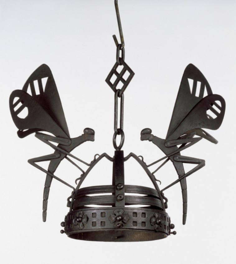 Le forgeron Alessandro Mazzucotelli Il est lui aussi Milanais. Il réalise peu après l’exposition, entre 1903 et 1906, une suspension pour éclairage électrique en fer forgé, découpé.