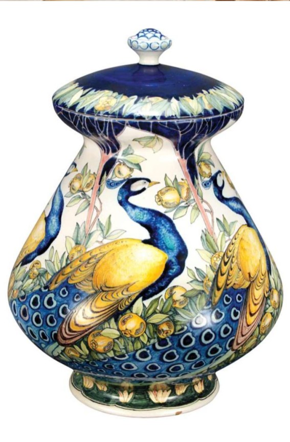 A Florence en 1896, Galileo Chini (1873-1956 ) crée la manufacture « Arte de la Ceramica ». Il orne ses vases de fleurs de tous types, de poissons, d’oiseaux, de plumes de paon.