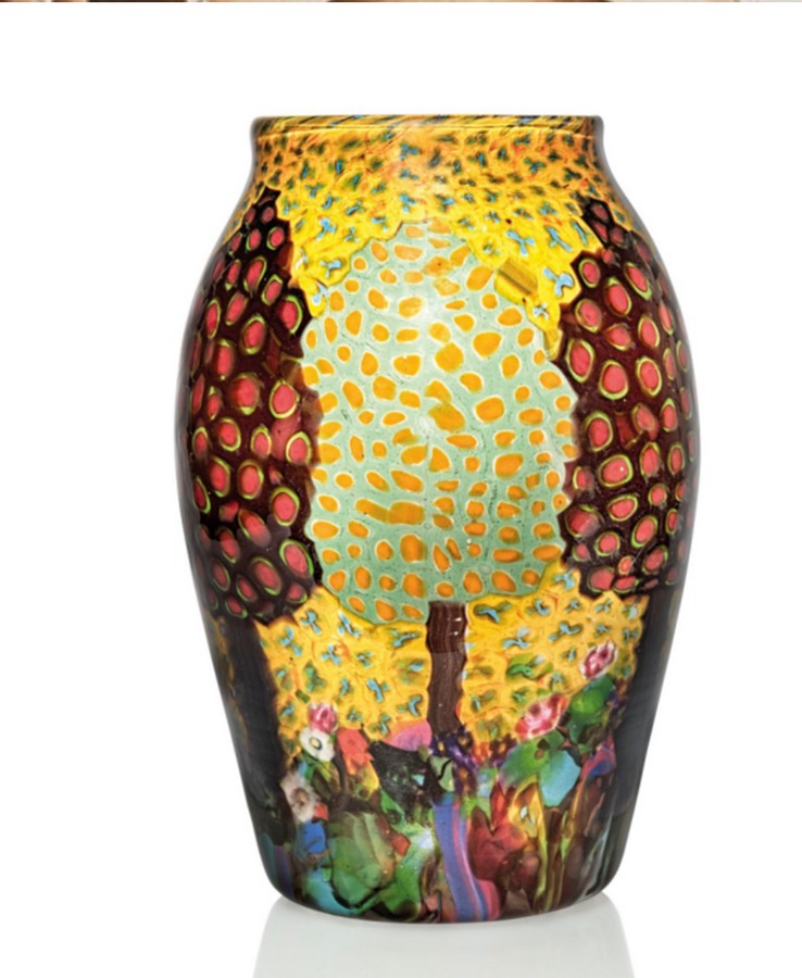 A Murano, Artisti Barovier réalise des vases à murrines, des baguettes constituées de plusieurs couches de verre de couleur découpées en rondelles et assemblées (en vente publique 707 000 £).