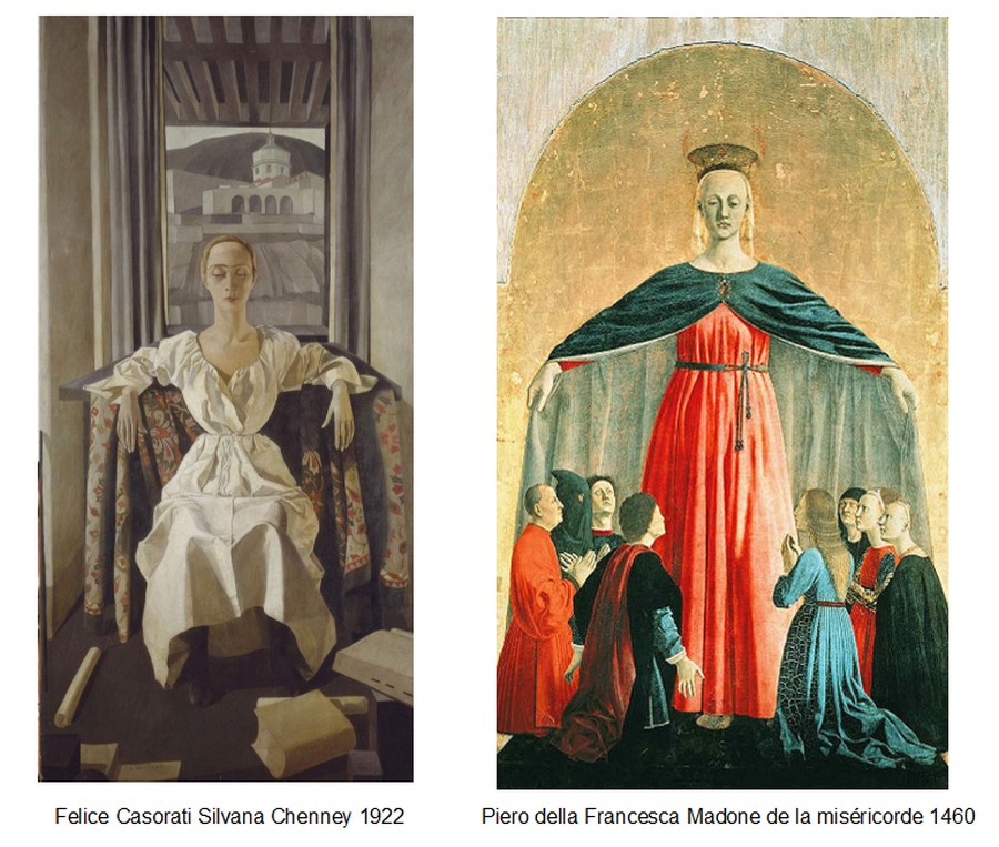 Il s’inspire de l’art de Piero della Francesca pour produire une peinture néo-Renaissance dont les protagonistes sont des personnages immobiles, représentés dans des poses frontales, dans des compositions froides et rigoureusement géométriques : Portrait de Silvana Cenni . A l’arrière-plan, derrière la figure apparaît un dessin d’architecture qui rappelle une vue de la ville idéale conservée à Urbino. Le réalisme de la représentation, va au-delà de la réalité elle-même, offrant un espace immobile et hors du temps.