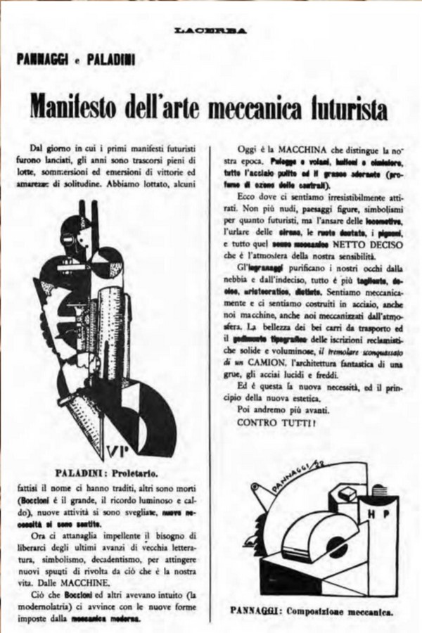 Le manifeste futuriste de l’art mécanique se veut un témoignage des luttes sociales. Il fait du « prolétaire d’acier et de coke » l’homme du futur. Vinicio Paladini affirme : « J’ai abandonné les anciennes recherches de mouvement, qui avaient donné naissance au système technique de la compénétration des plans (1), pour d’autres recherches constructives et architecturales. J’ai essayé de projeter des données qui appartiennent au domaine spirituel de [l’homme] ». Dans le manifeste de 1922, Paladini représente un prolétaire, une fusion du futurisme et du constructivisme russe.