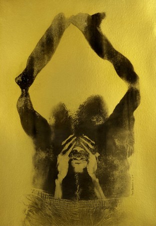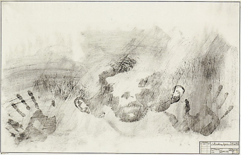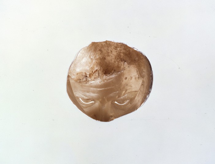 En 1962, l’artiste a réalisé l’expérience suivante, il a soigneusement enduit son visage et ses mains d’huile puis, saisissant un papier fin posé devant lui, il l’a appliqué à 2 mains sur son visage en pressant bien de façon à laisser des empreintes grasses sur le papier. Il a ensuite saupoudré ces traces grasses de poudre de graphique et obtenu ainsi un étrange portrait dont on ne sait s’il est en train de disparaître dans le support ou au contraire en train d’émerger. On retrouve la place des oreilles identique à celle du masque d’or Agamemnon.
