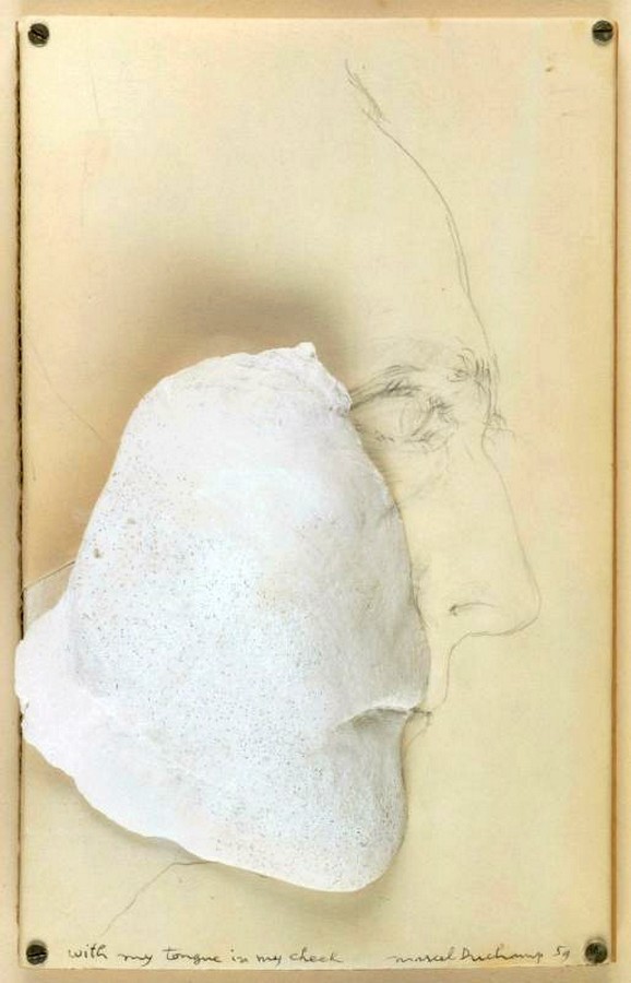 Duchamp (With My Tongue in My Cheek, 1959) confronte empreinte et dessin, matérialité et illusion.