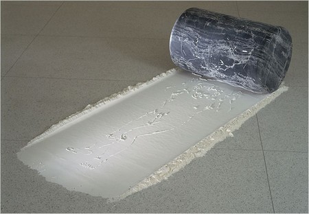 En 1998, Luciano Fabro, Sisyphe, c’est un cylindre de marbre gravé qui laisse sur un tapis de farine la trace d’un corps d’homme Sisyphe est cet homme condamné par les dieux grecs à rouler un rocher jusqu’au sommet d’une montagne.