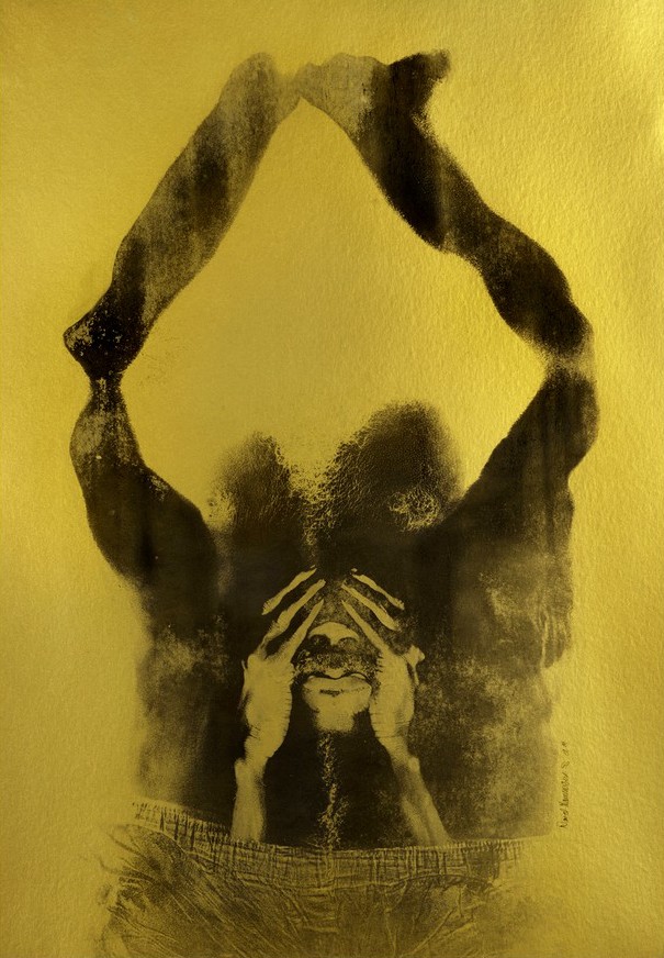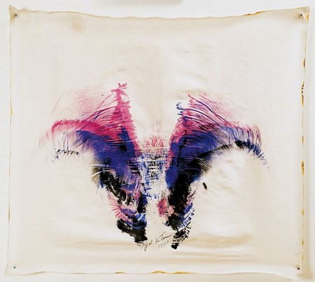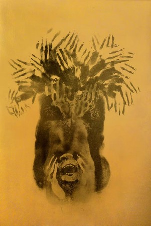 Puis il a mêlé des empreintes de son visage avec celles d’autres fragments de son corps pour créer des sortes de masques africains, ou composer d’étranges figures colorées mêlant empreintes et traces de mains.
