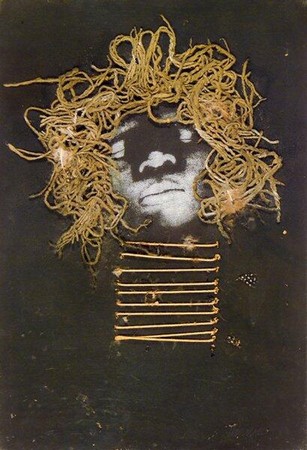 D’autres impressions corporelles s’accompagnent de collages de matériaux, ficelles, épingles et de papiers collés et peints.
