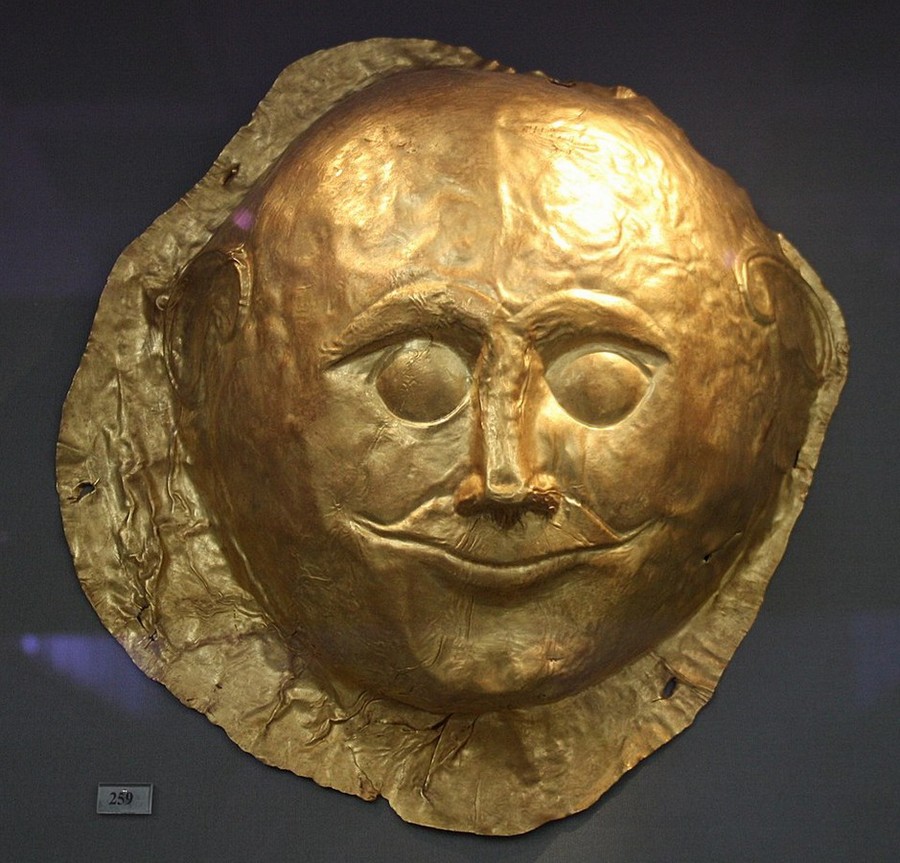 Au XVIᵉ siècle av. J.-C., les masques funéraires en or de Mycènes, dont le célèbre masque dit d’Agamemnon, sont obtenus par empreinte directe sur le visage du mort a l’aide d’argile ou mieux de feuillets d’or, pour en conserver le masque. Remarquez la place des oreilles qui, en raison des processus d’empreinte sur le volume du visage se retrouvent presque sur le même plan que la face.