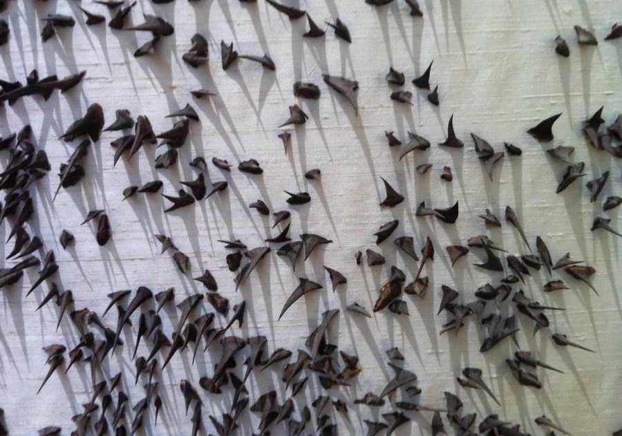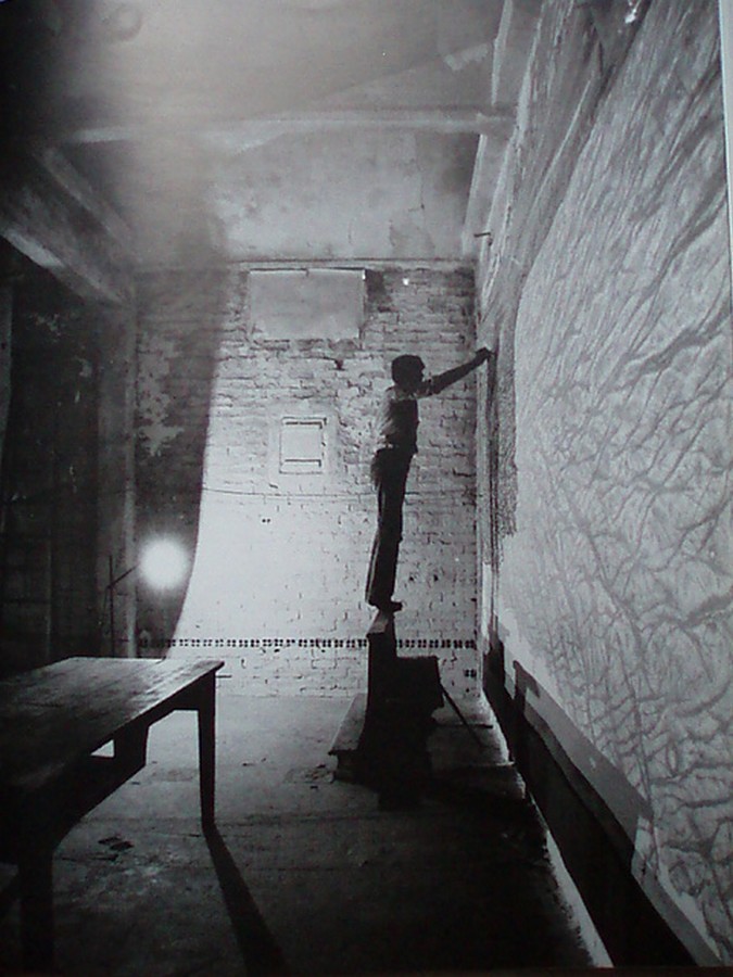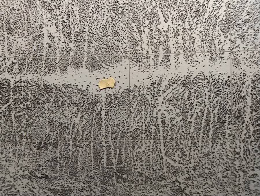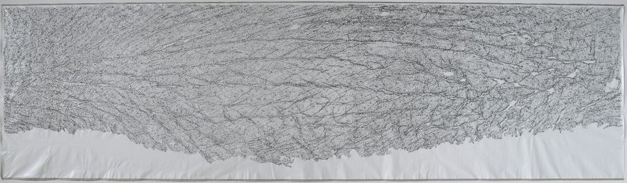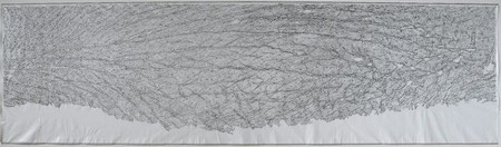 Dépouilles d’or sur épine d’acacia. En 2001- 2002, il a renouvelé l’expérience de l’empreinte réalisée à la colle cellulosique sur sa bouche. Mais cette fois, la projection à grande échelle a été faite sur un tissu car la matérialisation des lignes projetées n’a pas été faite au crayon mais avec des milliers d’épines d’acacia piquées dans le tissu de soie.