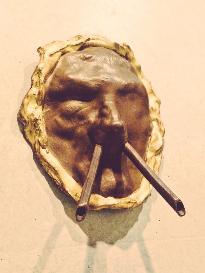 Il écrit : « Ni un visage, ni un masque : l’extérieur d’un moulage, le renvoie à ce qui est derrière, comme si le moulage était un peu transparent. Les 2 tiges de bambou qui sortent ont été laissées pour accentuer le lien entre intérieur et extérieur. Ce sont elles qui permettent au modèle de respirer. S’il respire, c’est qu’il est vivant. La couronne dorée est aussi déterminante, en ce sens, l’image même m’a invité à l’appeler Tamerlan, celui qui détruisit des villes entières, des civilisations entières et qui transforma le bourg de Samarcande en un paradis de l’art« .