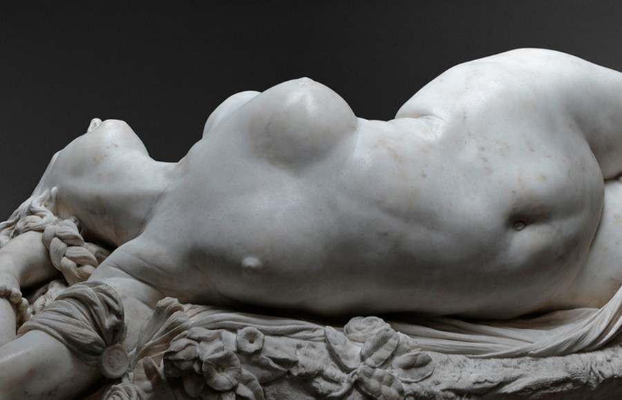 Auguste Clesinger a présenté au salon de 1847, femme piquée par un serpent qui fut jugé d’un réalisme excessif. Le ventre, la poitine et les cuisses ont été moulées sur nature sur le corps de Madame Sabatier, la maitresse du jeune sculpteur. Face au commérage, Théophile Gautier écrit un beau texte sur la « trop indécente » sculpture. En tout cas sans son serpent (référence à Cléopâtre), elle aurait été inexposable.