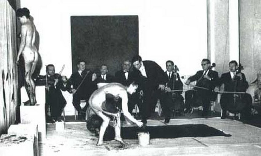 Yves Klein, action anthropométrie 9 mars 1960. L’artiste a minutieusement chorégraphié l’exécution devant public de cette action, un genre dont il a été pionnier en France. En présente d’un orchestre en costume sombre jouant la symphonie monoton, (une seule note), les jeunes femmes se sont mises en mouvement sur un geste de l’artiste lui aussi en costume et gantée de blanc. Et après s’être enduites de peinture bleue IKB sont allés se plaquer contre des supports papier fixés au mur. Elles ont ainsi laissé les empreintes des parties les plus charnues de leur corps, des empreintes intemporelles universelles sans tête qui disent le corps féminin à la manière des Vénus préhistoriques. Il y a la coexistence du temps court l’action, et du temps long, la trace dans la durée.