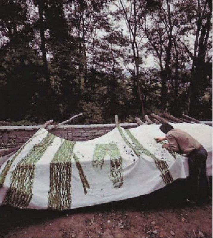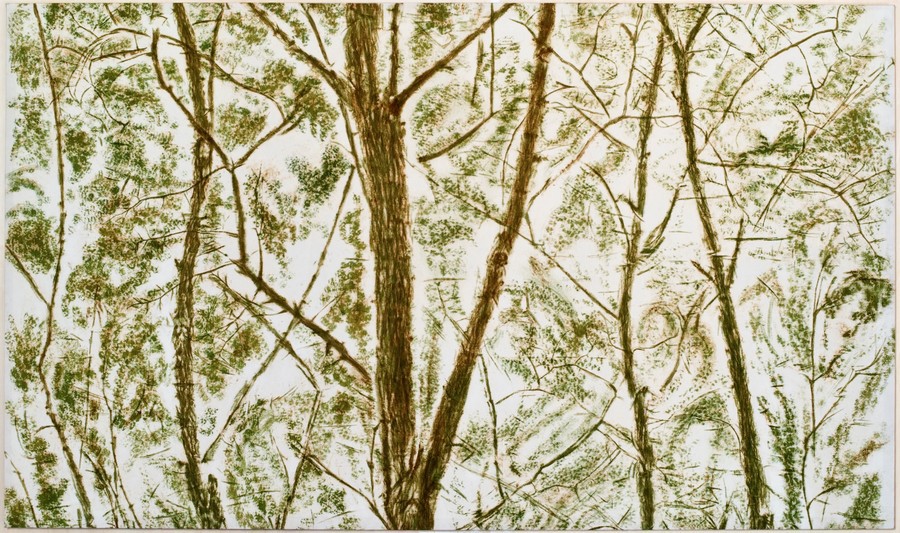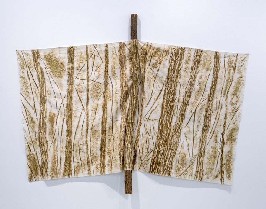 Giuseppe Penone et sa série Verde del Bosco (1986) : c’est le titre que Penone a donné à une série de frottages réalisés sur tissu avec de la mousse. L’artiste a enveloppé des arbres avec des morceaux de tissu blanc et, en frottant avec de la mousse, il est parvenu à faire ressortir les aspérités des troncs et des branches. Patiemment, en déplaçant son tissu de multiples fois, il est arrivé à reconstituer l’image d’une forêt. Des empreintes 100 % naturelles.