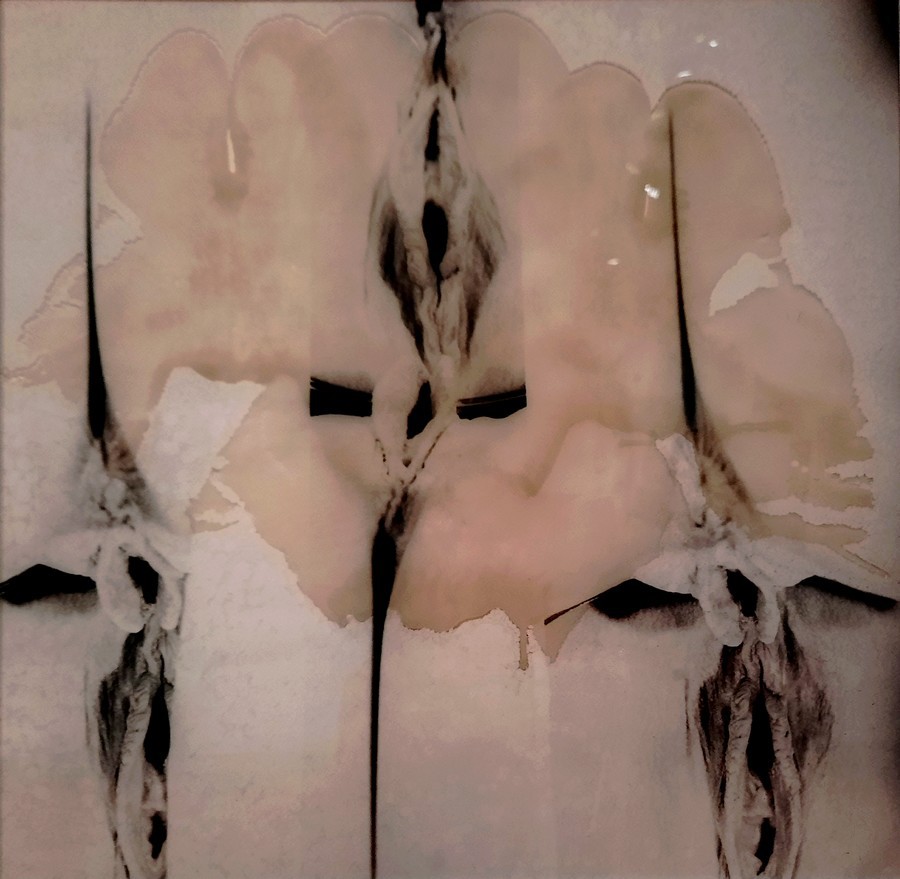 Enfin, la série Roses Turques s’inspire directement de L’Origine du monde de Courbet. Elle se concentre sur le sexe féminin, que l’artiste a photographié puis retravaillé entre abstraction et figuration, y ajoutant de l’encre, du crayon et des fragments d’empreintes. Pour brouiller l’image, l’artiste a d’abord impressionné la pellicule à plusieurs reprises, puis a rehaussé l’épreuve obtenue d’empreintes peintes avant de re-photographier l’ensemble. Les titres tels que Masque d’encre Elle et les cartels précisent les matériaux : film argentique, transparent, tressage, poudre de marbre, pastel, cire.